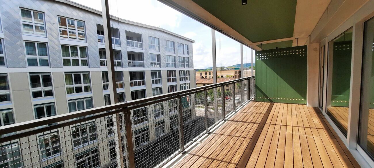 Weiter verfügt die Wohnung über einen grossen Balkon mit Holzrost, der zum Verweilen einlädt. Der Balkon ist vom Arbeitszimmer und vom Wohnzimmer zugänglich.