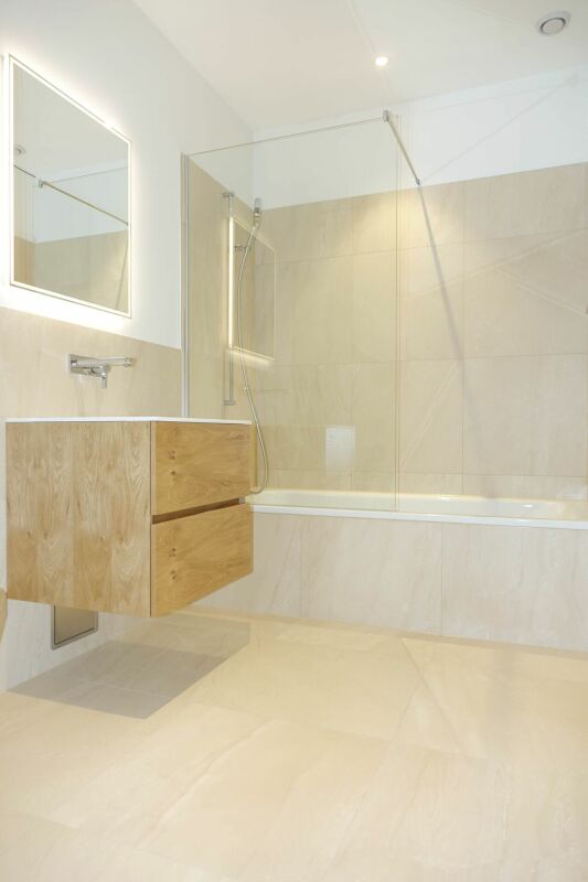 Die Wohnung verfügt über einen hochwertigen Parkettboden, welcher in der gesamten Wohnung verlegt wurde. Die beiden Nasszellen sowie das Reduit wurden mit schönen hellen Bodenplatten gefliest. Mit einer Dusche und einer Badewanne ermöglichen die Badezimmer maximale Flexibilität, zudem sind nützliche Unterbaumöbel vorhanden, welche zusätzlichen Stauraum bieten.
